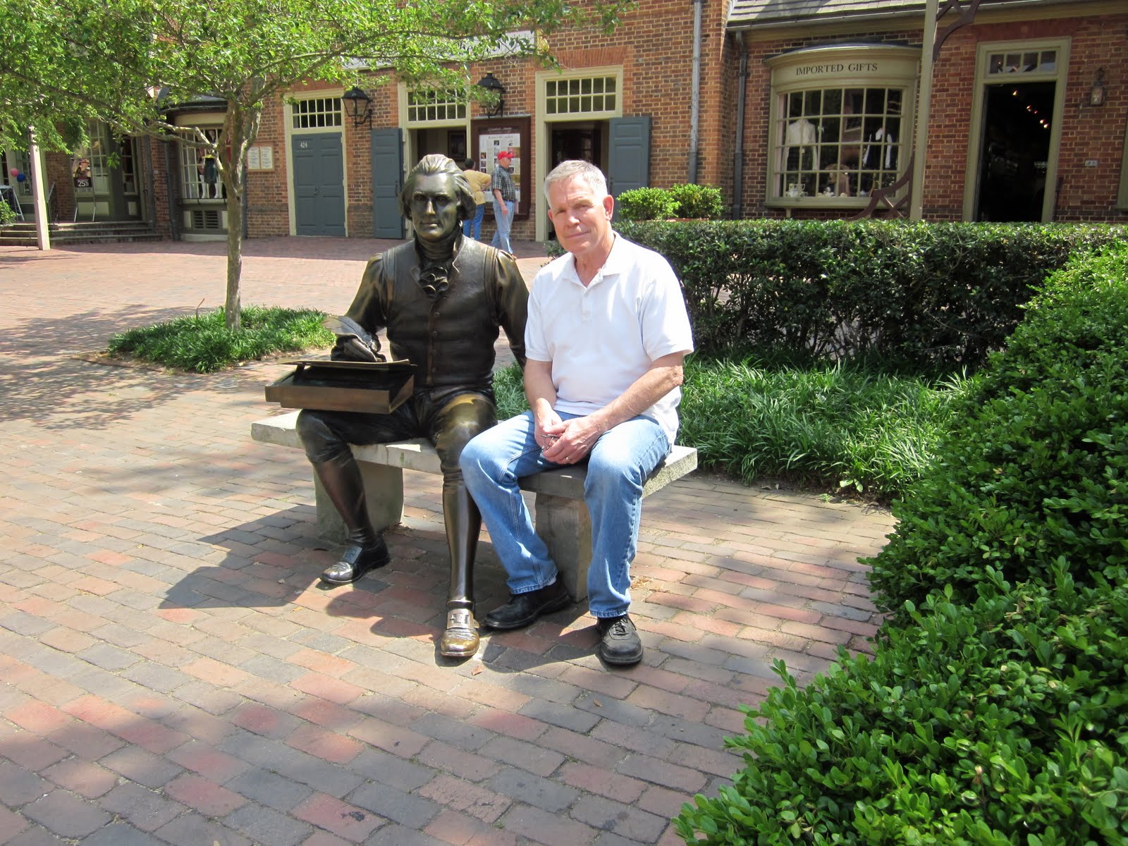 Tuesday, May 3, was such an enjoyable, educational day! After a comfortable night in a local hotel we spent the day walking the streets of Colonial Williamsburg, where so much of early American colonial history took place. Through the handsome financial gifts of men like John D. Rockafeller, this historic community has been preserved and maintained as it would have appeared in those early colonial days. Three thousand employees, actors, interpretors, workers and tradespeople, all in period costume, help to create an atmosphere that transports the visitor back in time. They speak, dress and act their parts as if they were really living in the Williamsburg of Washington and Jefferson's day. It is such worthwhile thing to be here and see this place in our history.